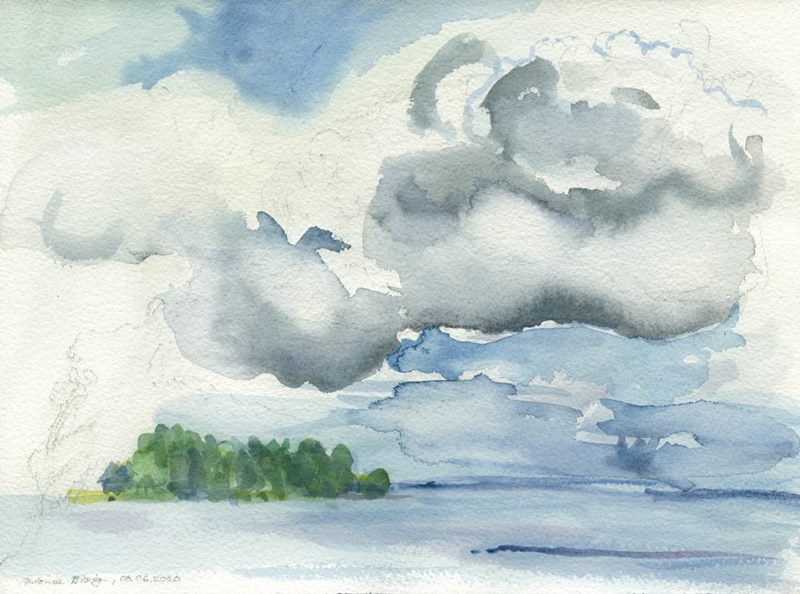 Wolkengebilde über der Havel Höhe Gutspark Neukladow am 05.06.2020, Aquarell auf Arches-Aquarellpapier, 18 x 26 cm, Foto: Thomas Keller |