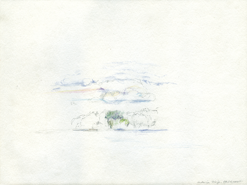 abgeschrieben - Wolken über Hafel-Ufer am 09.06.2020, Farbstift auf Aquarellpapier, 30 x 40 cm, Foto: Thomas Keller |
