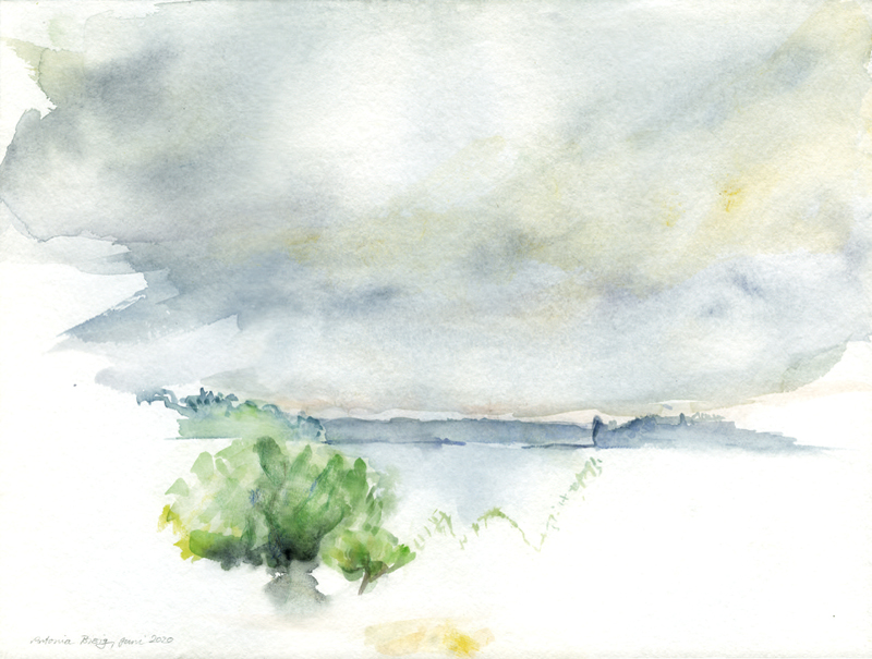 Wolkendecke über Havel, Schwanwerder und Grunewald im Juni 2020, vom Gutspark Neukladow aus gesehen, Aquarell auf Bütten, 30 x 40 cm, Foto: Thomas Keller |
