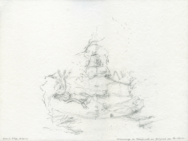 Vermessung des Elsengrundes im Gutspark Neu-Kladow in westöstlicher Richtung im Juni 2020, Bleistiftzeichnung auf Bütten, 30 x 40 cm, Foto: Thomas Keller |