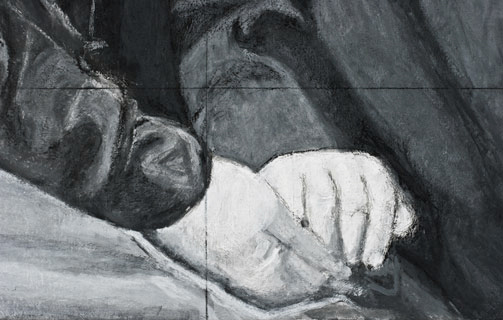 Die Arbeit an meinem Bild bestand darin, die Fotografie aus Ihrem Buch zu vergrößern (117cm x 168cm) und in Malerei und Zeichnung (Eitempera, Kohle, Kreide und Bleistift auf Leinwand) umzusetzen, mich möglichst genau an die Vorlage zu halten und dabei auf technische Hilfsmittel zu verzichten. Wie bei der Arbeit am Bild-Korpus korporation zum Thema der Selbstunterwerfung ging es mir darum, meine Wahrnehmungsfähigkeit zu testen und heraus zu fordern sowohl beim Mal- und Zeichenvorgang selber als auch beim Betrachten des im Entstehen begriffenen Bildes, dabei mein Erleben, Fühlen und Denken zu schärfen, also über diesen sinnlichen Verarbeitungsprozess zu neuen Fragen, Erkenntnissen und Stellungnahmen in bezug auf das Thema "Familie" zu gelangen.