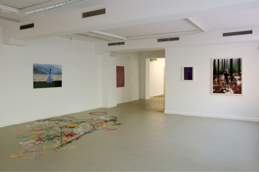 In ihrem Arrangement Heimspiel - o.T. , bestehend aus einer großformatigen Fotografie und 36 Gummitwists, greift die Künstlerin auf Reminiszenzen ihrer Spielaktionen und Performances im Rahmen des Kunst-Parcours Lost in Tugium im Zuger Stadtraum 2012 zurück sowie auf die Choreographie ...aus der Stille - Hommage á Hodler aus der Zeit ihres Stipendienaufenthaltes 2005 in Zug.
