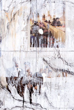 Acryl, Kohle und Kreide auf aufgerissene Zeitungsschichten