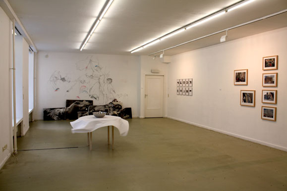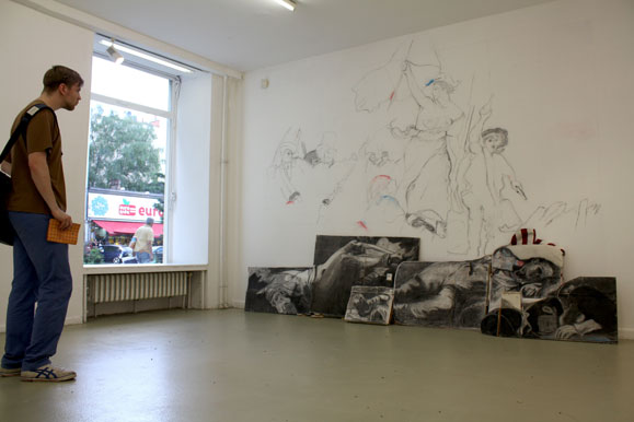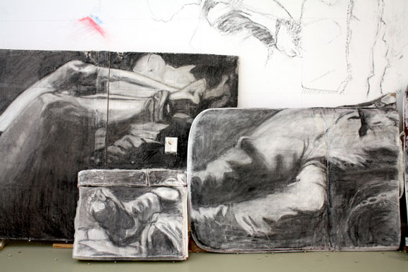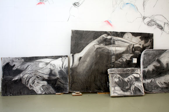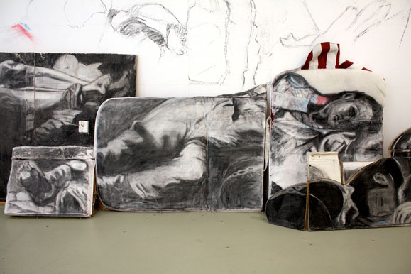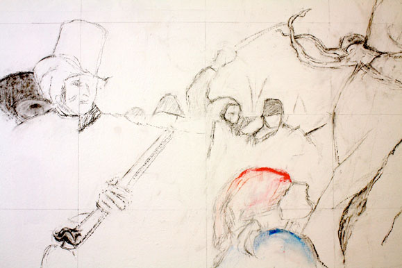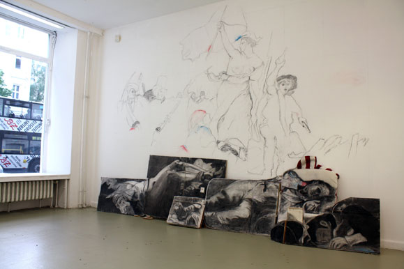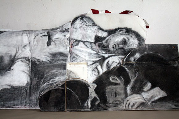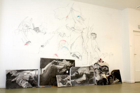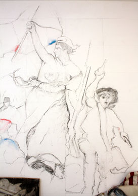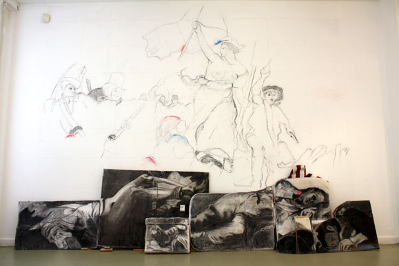Mein grösstes Interesse bei meinem Vorhaben galt den drei toten Soldaten im Vordergrund des Gemäldes. Revolutionen bringen neue Hoffnungen, aber auch Tod und Versehrungen an Leib, am Fühlen und Denken. So beschloss ich, diese drei Gefallenen in Originalgrösse ganz genau nach Delacroixs Darstellung mit Kohle auf gefundene Sperrmüllstücke (Holz- und Polsterteile) zu zeichnen. Der Verweis ist Augen fällig: Tote als Sperrmüll von Revolutionen, bald vergessene Opfer gesellschaftlicher Umwälzungen. Die fragmentierten Werkteile, auf denen die Gefallenen abgebildet sind, schichtete ich so hinter einander, so dass die Darstellung relief-artig in den Raum greift. Damit entwickeln Sterben und der Tod eine heraus gehobene räumliche und materiell sinnliche Präsenz vor der Marianne mit Jakobinermütze, barem Busen, Flinte und Trikolore. Sie, der Junge mit dem roten Kopftuch zu ihren Füßen und die bewaffneten Vertreter der verschiedenen Stände unter einem stürmischen, bläulich-rötlich-wießlich schimmerndem Himmel zeichnete ich mit Kohle und einer Spur farbiger Kreide zurückgenommen, aber ebenfalls in Originalgrösse auf die Galeriewand in Anlehnung an die Form des Graffitis.